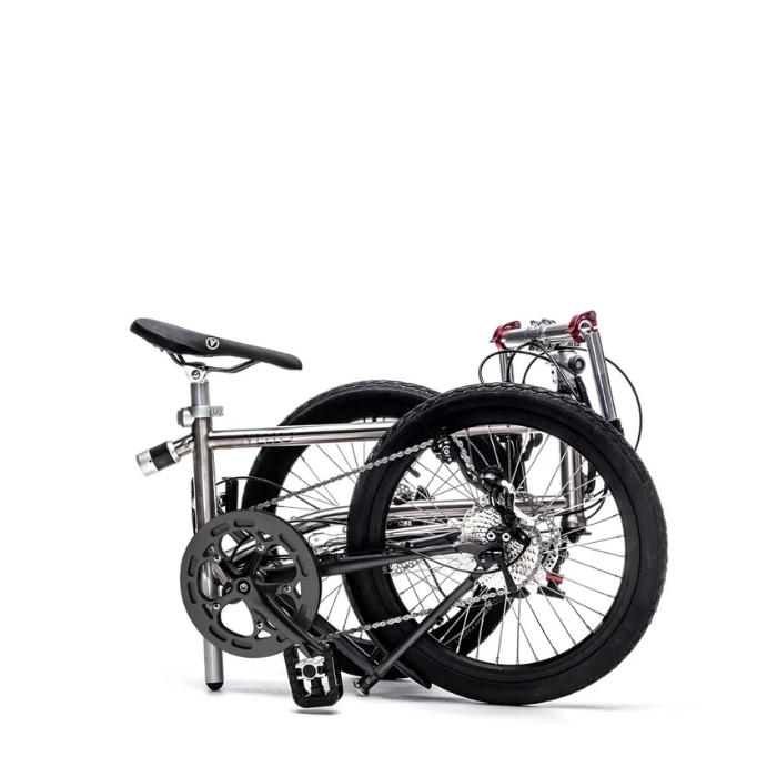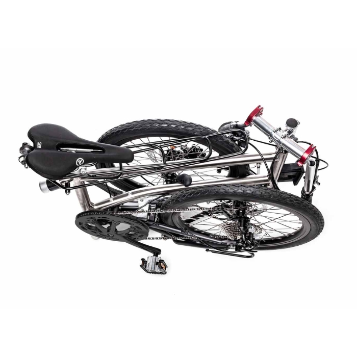 Cuadro: Multitalla, unisex, cuadro de titanio, horquilla de cromoly y triángulo trasero / amortiguador con mecanismo de plegado magnético de elastómero.