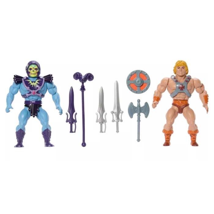 Celebre los 80 años de juguetes de Mattel con este paquete doble de Masters of the Universe del bien contra el mal que incluye a He-Man y Skeletor en estilo retro, ambos con un movimiento de giro y golpe.